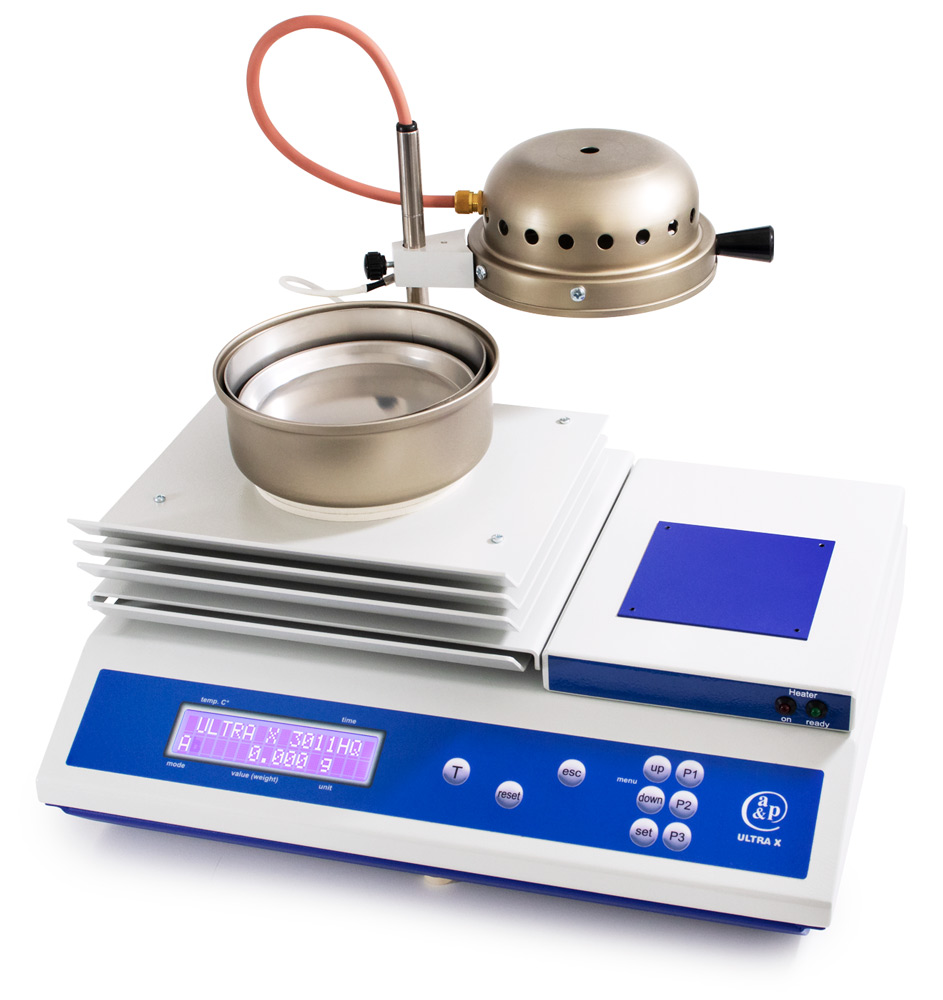 Das Funktionsprinzip ist Trocknen bei gleichzeitigem Wiegen, der Gewichtsverlust wird in % angezeigt. Der Feuchtebestimmter ist besonders für den Betrieb direkt an Produktionsstätten und im Labor geeignet.